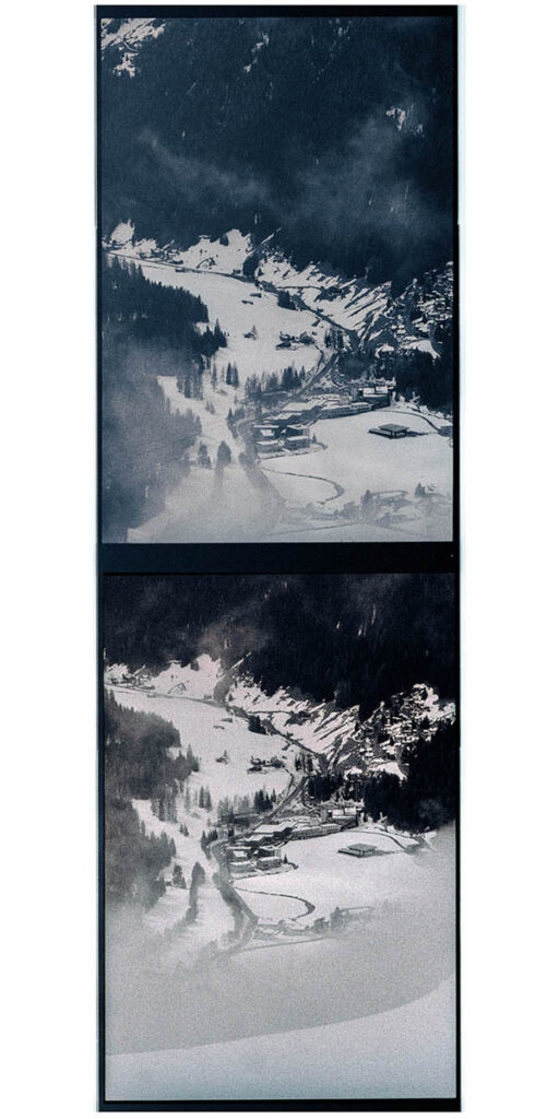 Early March 2026 I visited ‘Berghof Der Alpschatz’, the venue where Thomas Mann situated his novel Der Zauberberg/The Magic Mountain. In three days I had deep dive in the interior of the Der Alpschatsz and the surrounding landscapes. I transferred my impressions in several digital and analogue diptychs.
